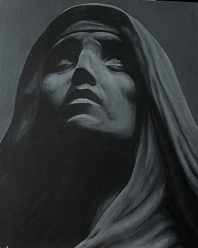 This painting portrays a sculpture of a nun looking upward. I created it to experiment with perspective and light, exploring how different angles and illumination could challenge and improve my painting technique.