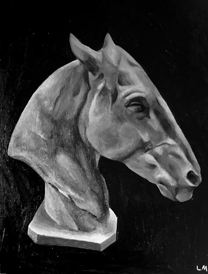 This monochrome acrylic painting depicts the bust of a horse. I created it as an exploration outside my usual focus on people and portraits, challenging myself to see if I could capture the same depth, form, and emotion in a different subject.