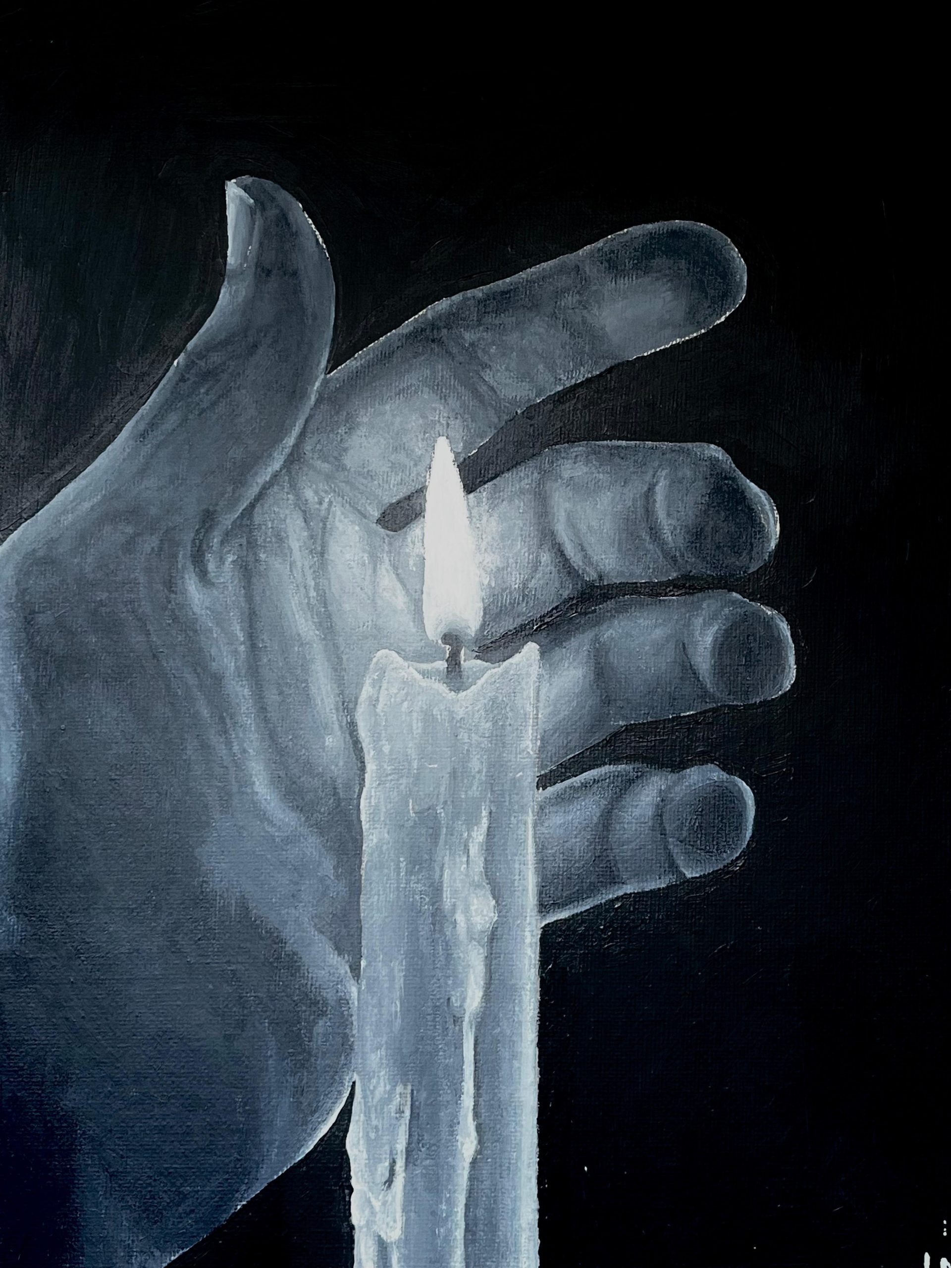 This unfinished acrylic painting depicts a hand holding a candle. I created it as a personal challenge: to study the complexity of the human hand and the subtle play of light from a single flame in a dark space.