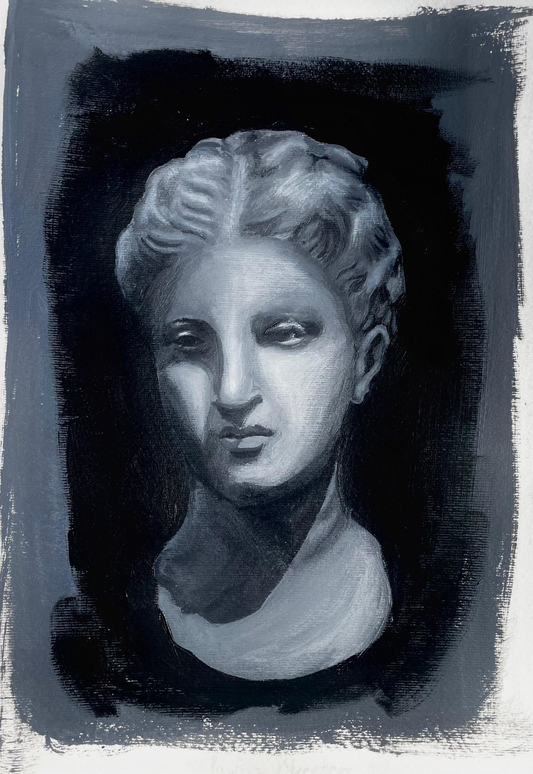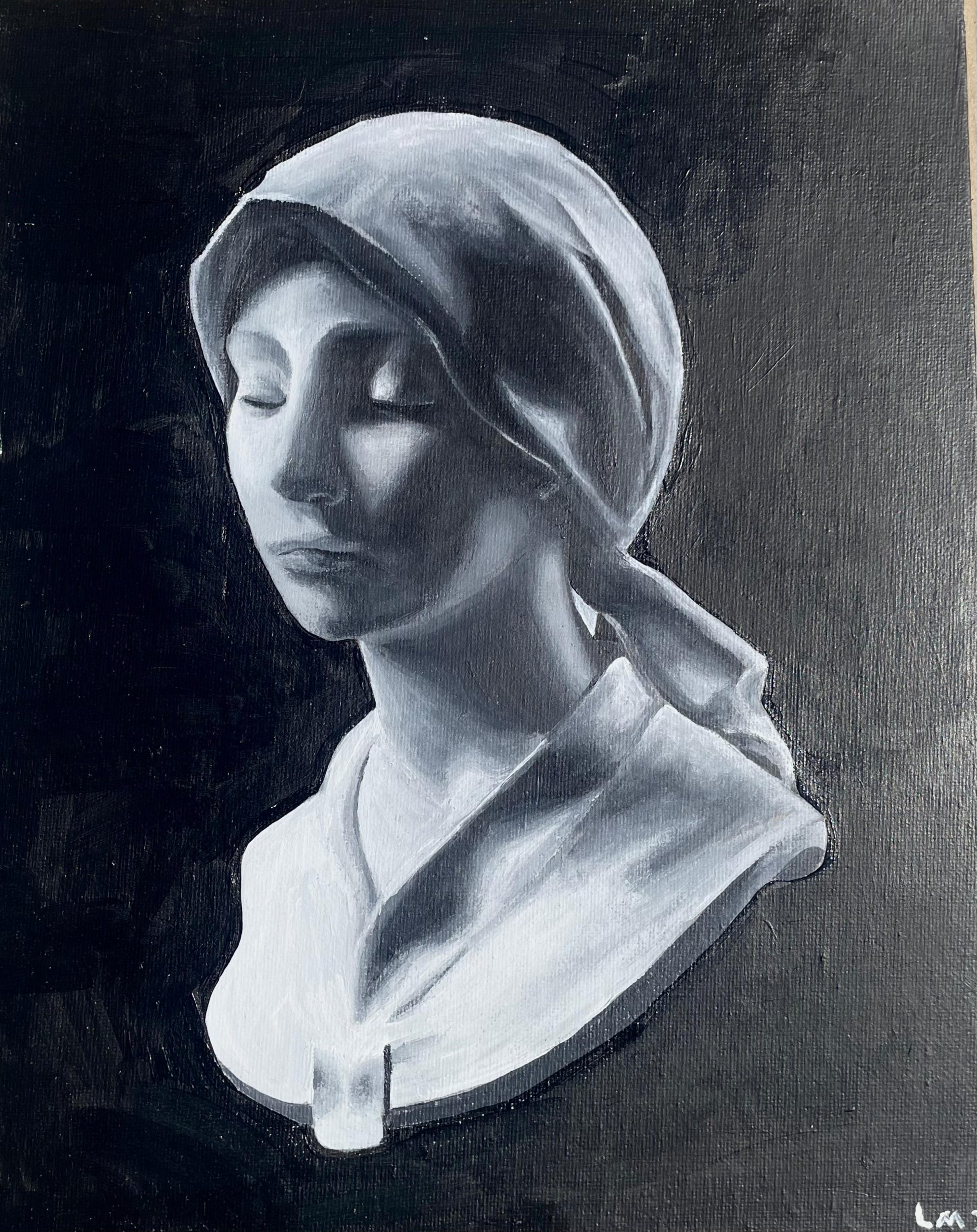 One of my first paintings, this bust of a young woman drew me in through its striking play of light and shadow. I was also fascinated by the draped cloth over her hair, which I wanted to explore in paint for the first time.