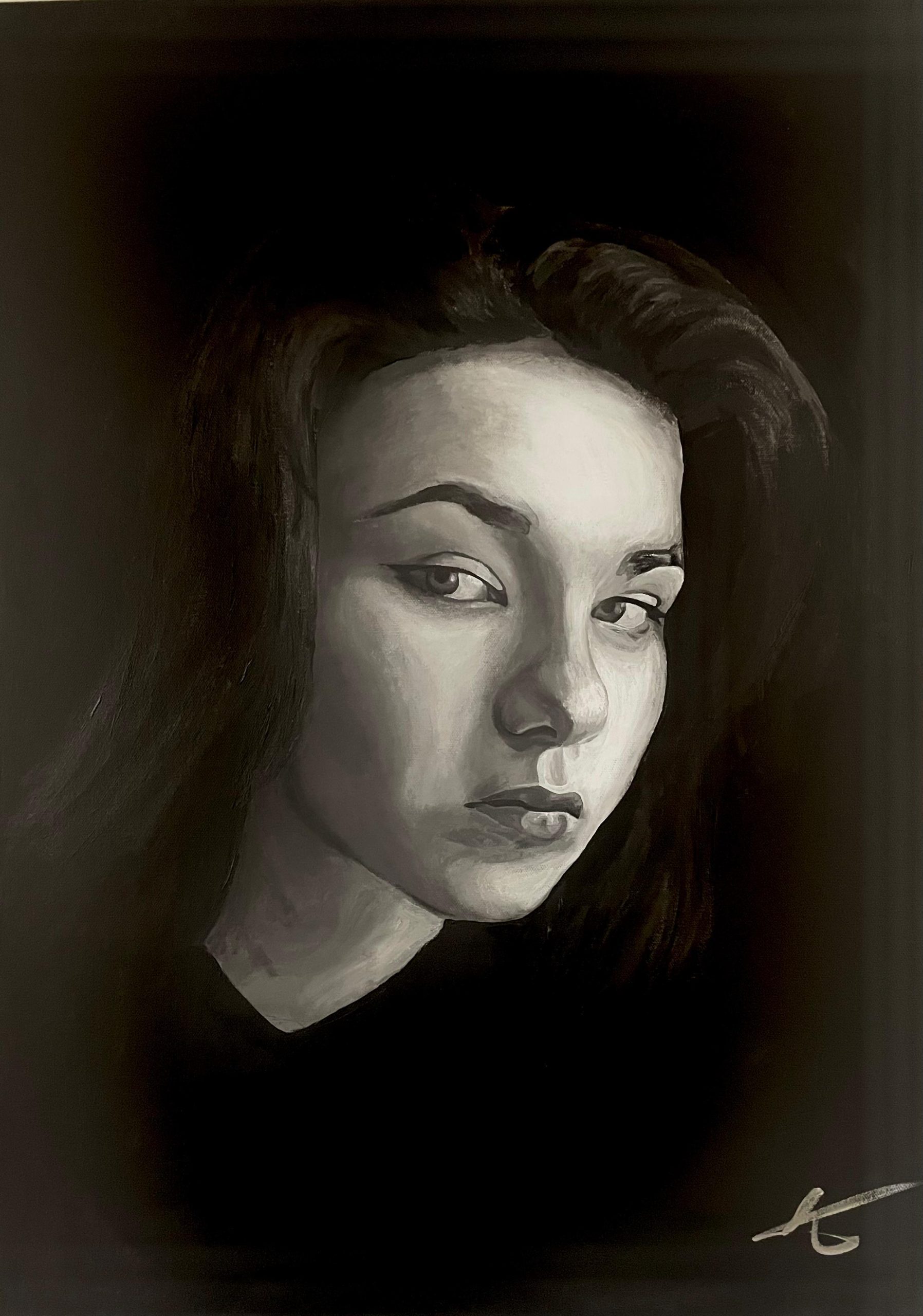This monochrome acrylic self-portrait explores how I see myself today. Inspired by classical sculpture and the play of light and shadow, it reflects both strength and vulnerability. The work is not meant to be perfect, but a mirror of growth – a confrontation with my own self-image and the way I present myself to the world.